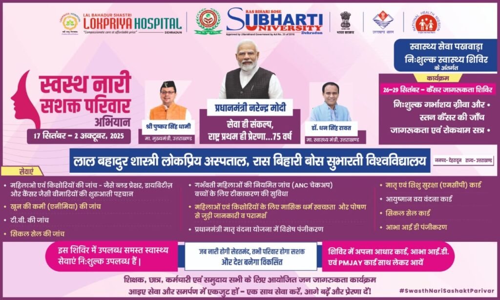 सेवा ही संकल्प और राष्ट्र प्रथम ही प्रेरणा के साथ, माननीय प्रधानमंत्री श्री नरेंद्र मोदी जी के 75वें जन्मदिवस को समर्पित सेवा पखवाड़ा 2025 के अंतर्गत लाल बहादुर शास्त्री लोकप्रिय अस्पताल एवं रास बिहारी बोस सुभारती विश्वविद्यालय द्वारा 17 सितम्बर से 2 अक्टूबर तक स्वास्थ्य सेवा पखवाड़ा आयोजित किया जा रहा है।