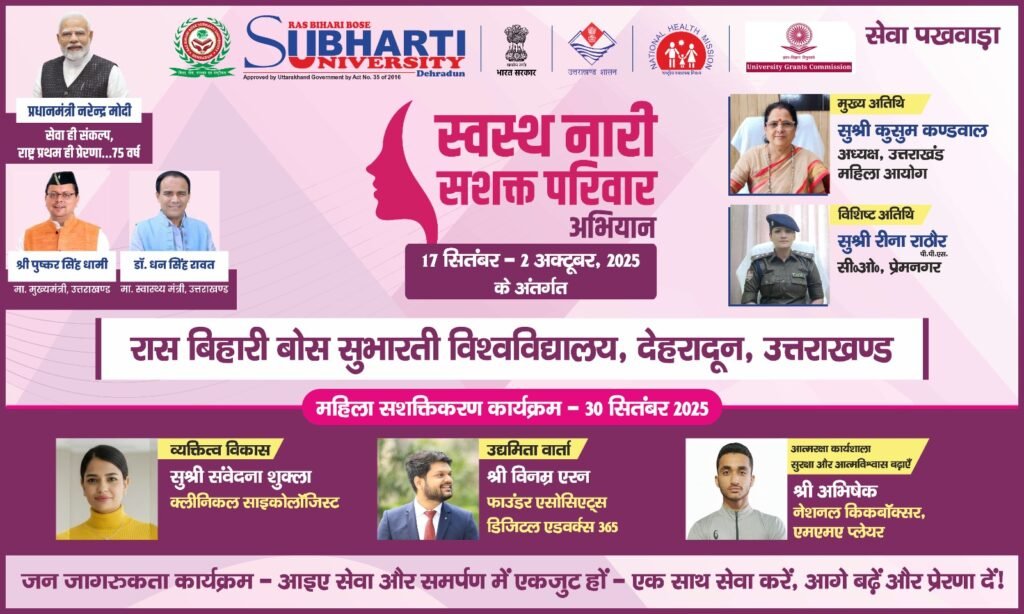रास बिहारी बोस सुभारती विश्वविद्यालय, देहरादून में कल 30 सितम्बर 2025, शनिवार को “स्वस्थ नारी – सशक्त परिवार अभियान” के अंतर्गत आज महिला सशक्तिकरण कार्यक्रम आयोजित किया जाएगा। यह आयोजन सेवा पखवाड़ा की श्रृंखला में किया जा रहा है, जिसका उद्देश्य महिलाओं को आत्मनिर्भर, जागरूक और आत्मविश्वासी बनाना है।