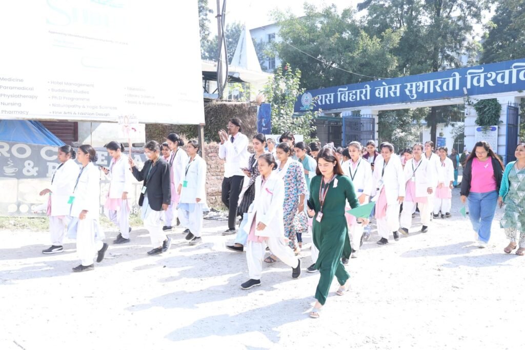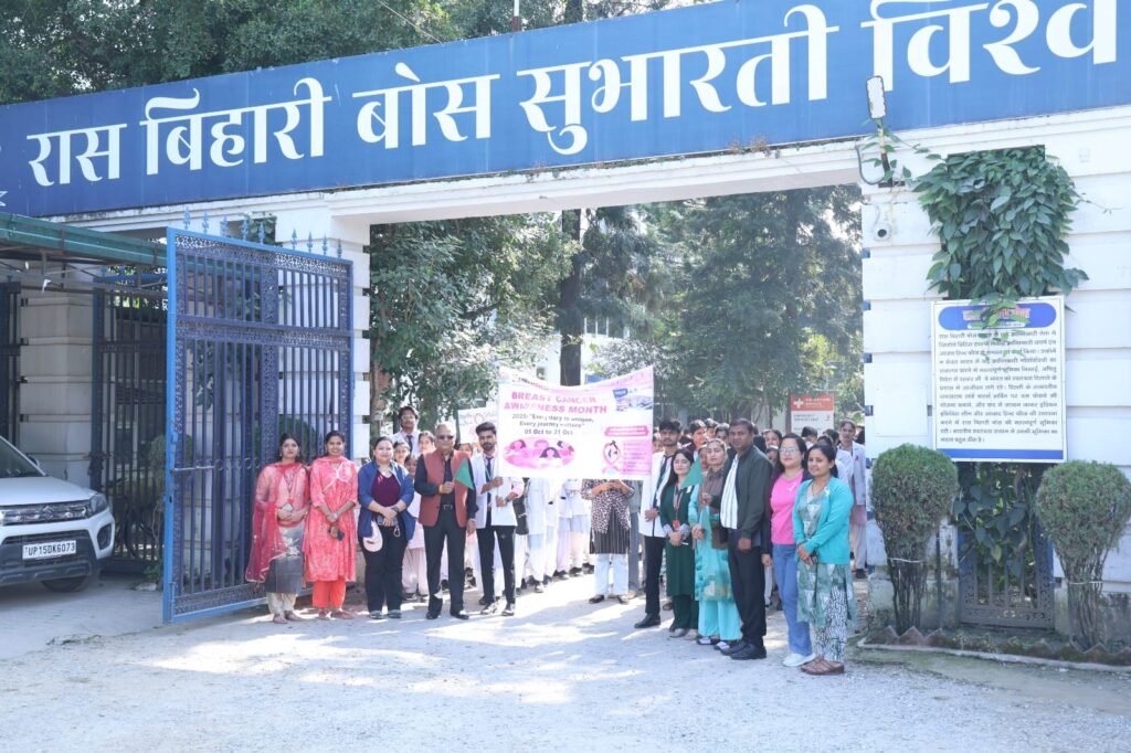 ब्रेस्ट कैंसर अवेयरनेस मंथ (ब्रेस्ट कैंसर जागरूकता माह) के अंतर्गत रास बिहारी बोस सुभारती विश्वविद्यालय, देहरादून ने “वियर पिंक, वाक फॉर होप” (Wear Pink, Walk for Hope) थीम पर एक प्रेरणादायक वॉकथॉन का आयोजन किया। इस आयोजन का उद्देश्य महिलाओं में स्तन कैंसर के प्रति जागरूकता बढ़ाना, समय पर जांच के महत्व को रेखांकित करना और समाज में संवेदनशीलता का भाव जागृत करना था।