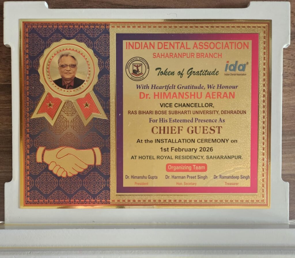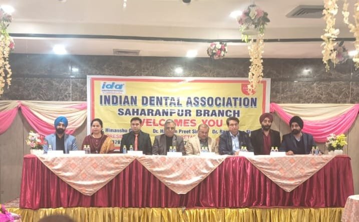 इंडियन डेंटल एसोसिएशन (IDA) सहारनपुर शाखा द्वारा होटल रॉयल रेज़ीडेंसी में इंस्टॉलेशन सेरेमनी एवं सीडीई कार्यक्रम दंत चिकित्सा की गुणवत्ता और मानकीकरण पर भव्य कार्यक्रम आयोजित किया गया। कार्यक्रम के मुख्य अतिथि वरिष्ठ शिक्षाविद् डॉ हिमांशु ऐरन वाइस-चांसलर, रास बिहारी बोस सुभारती यूनिवर्सिटी, देहरादून रहे। आयोजन में दंत उपचार में गुणवत्ता नियंत्रण और एक्रीडिएशन जैसे समसामयिक मुद्दों पर गंभीर एवं व्यावहारिक विमर्श हुआ।